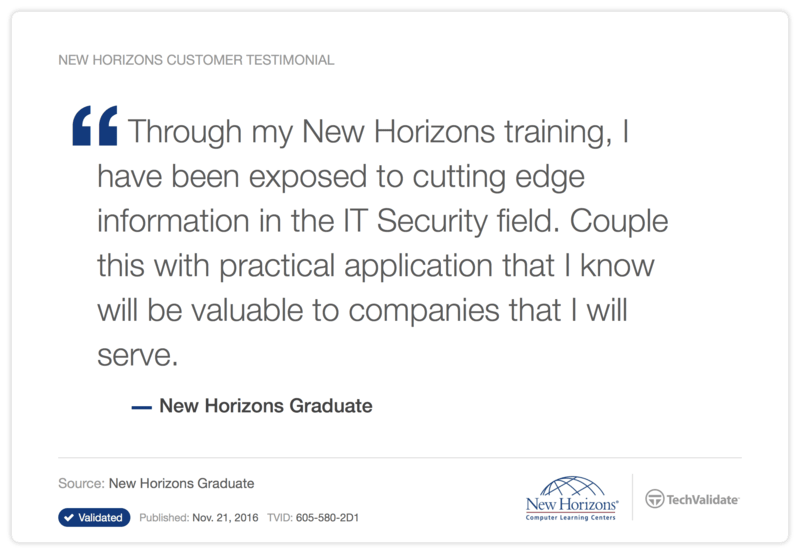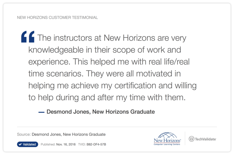 New Horizons Computer Learning Centers strives to deliver a consistent, top-of-class-training experience. Learn how our innovative learning methods have impacted past students: